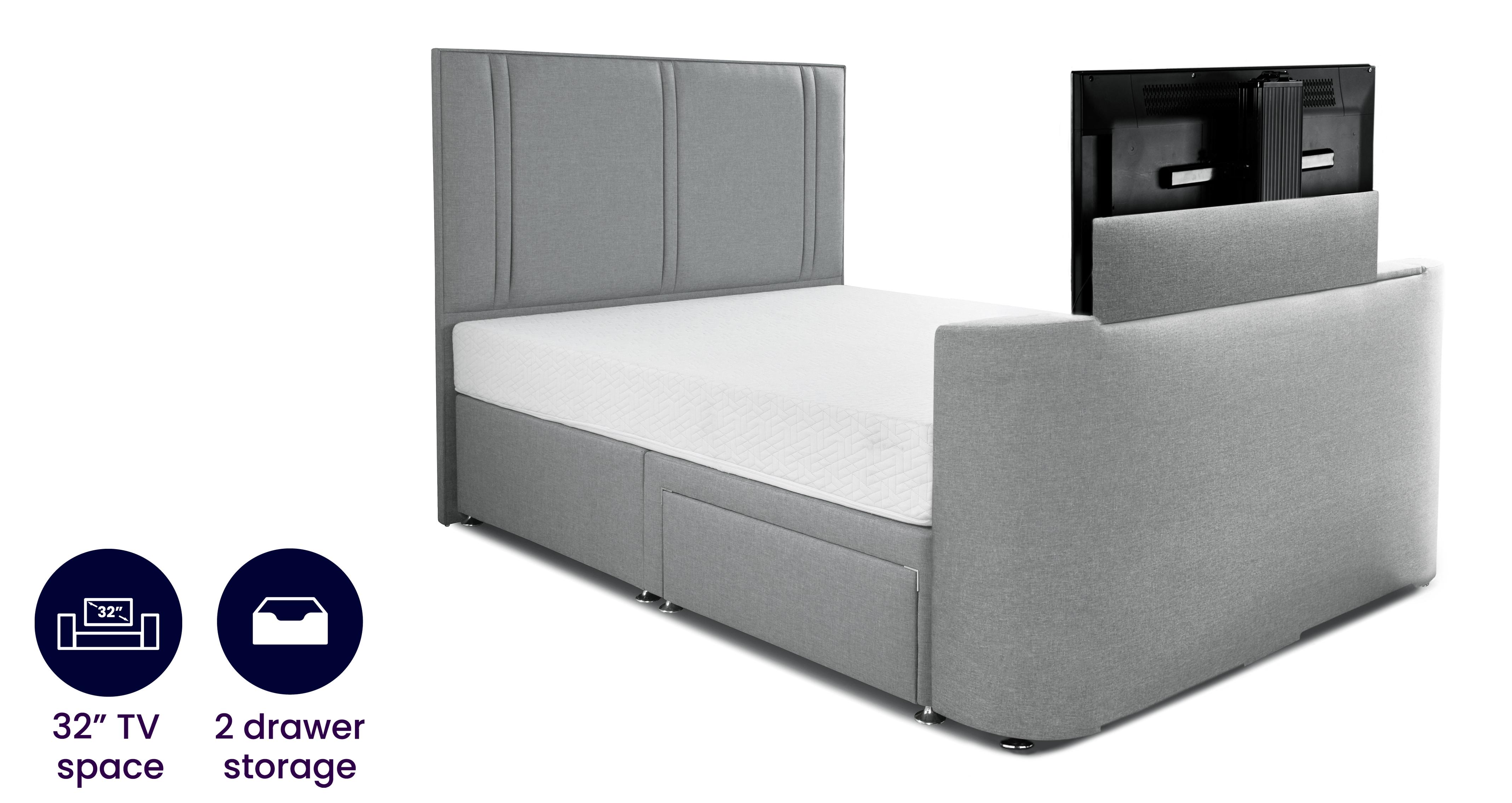 Ideal for end of bed use these motorized TV lift cabinets are finished on four sides. Divan TV beds usually come with additional underbed or ottoman-style storage and many bedstead models have additional compartments to store away digital devices chargers and leads to keep your bed clutter free. Our TV beds set up easily and function intuitively.